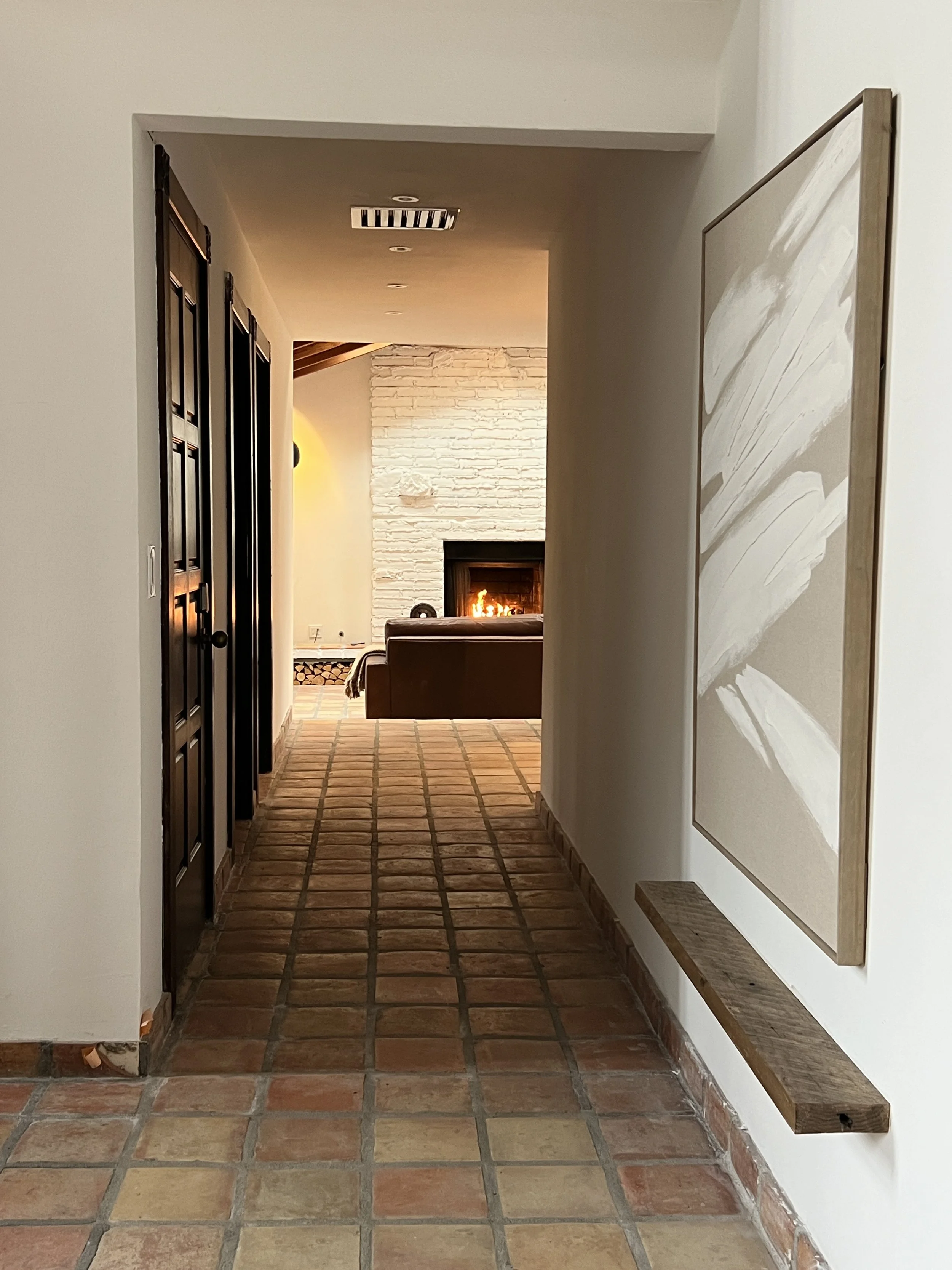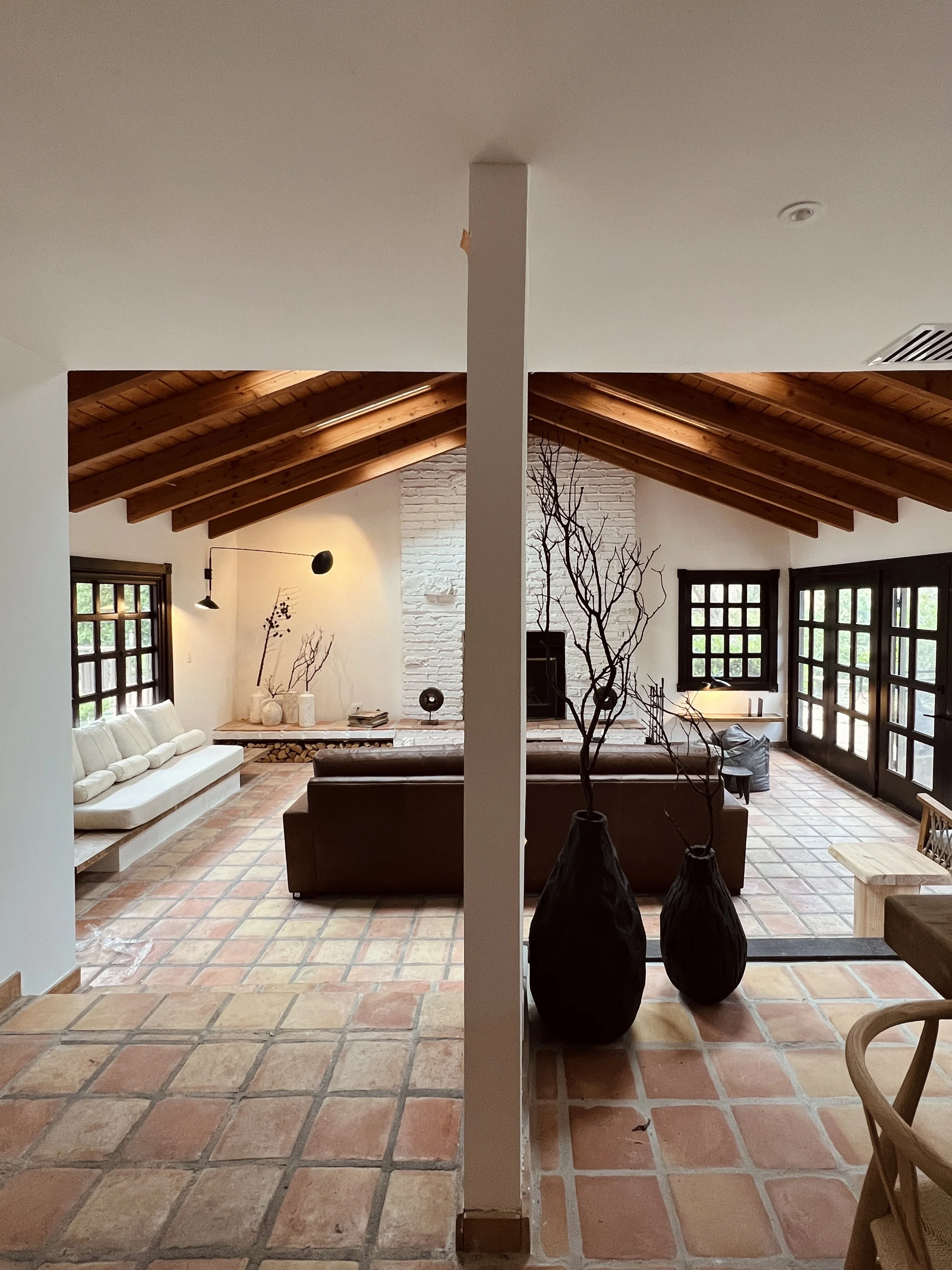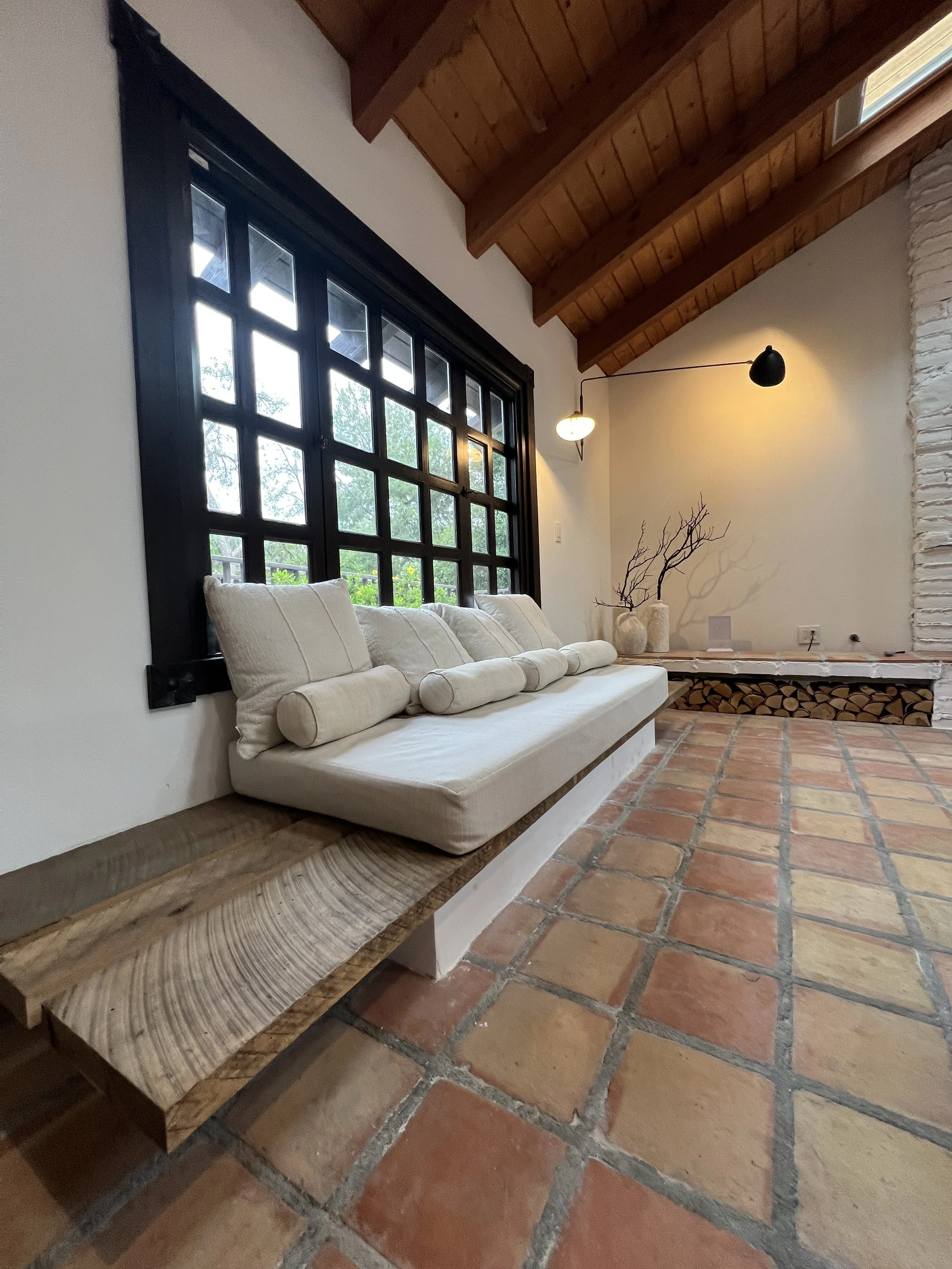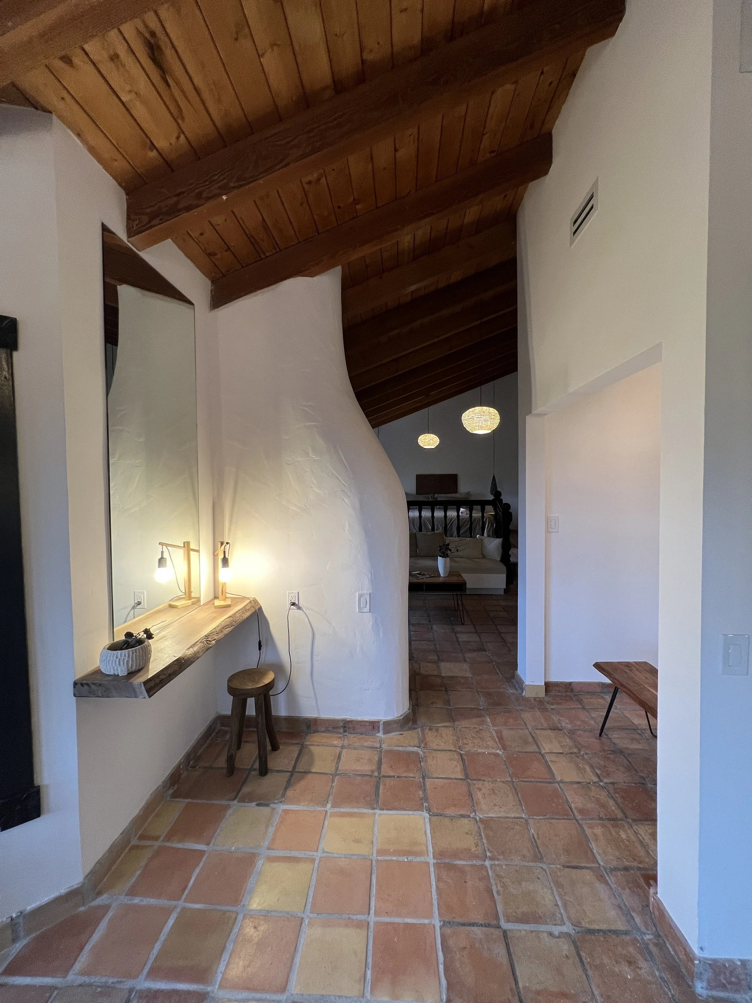 The renovation of the Buena Vista Farm House focuses on balance — preserving the warmth of traditional materials while introducing a sleek, modern aesthetic. The exposed wood ceilings, handcrafted terracotta floors, and textured plaster walls maintain the farmhouse’s authentic feel. Meanwhile, new design elements such as black fixtures, minimalist lighting, and clean lines bring a fresh, contemporary tone to the space.