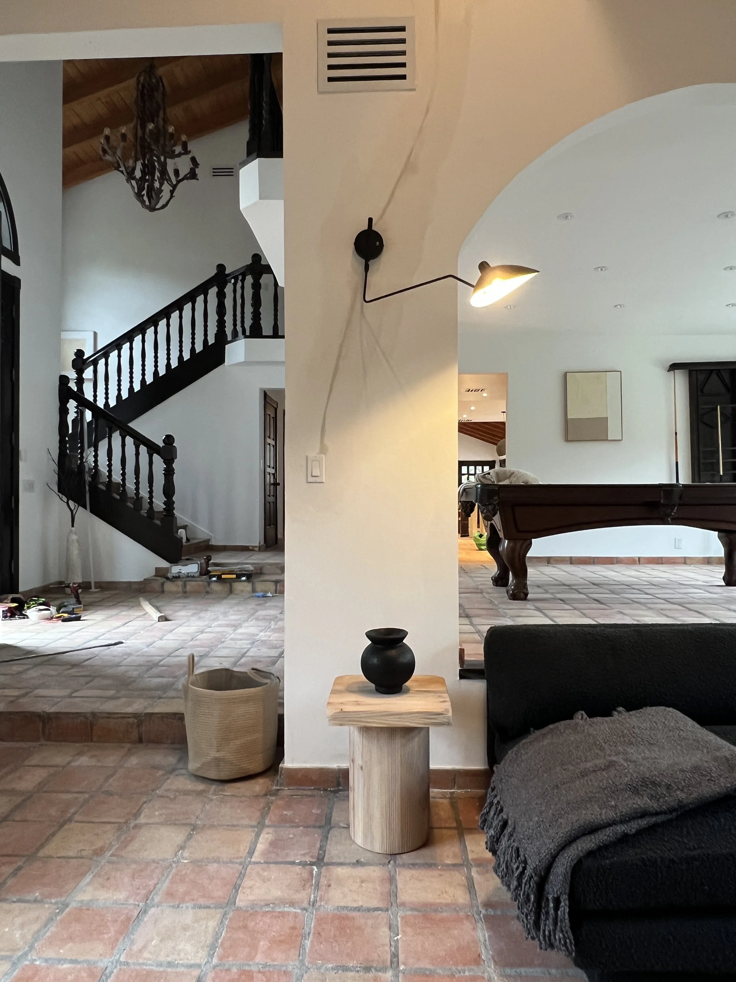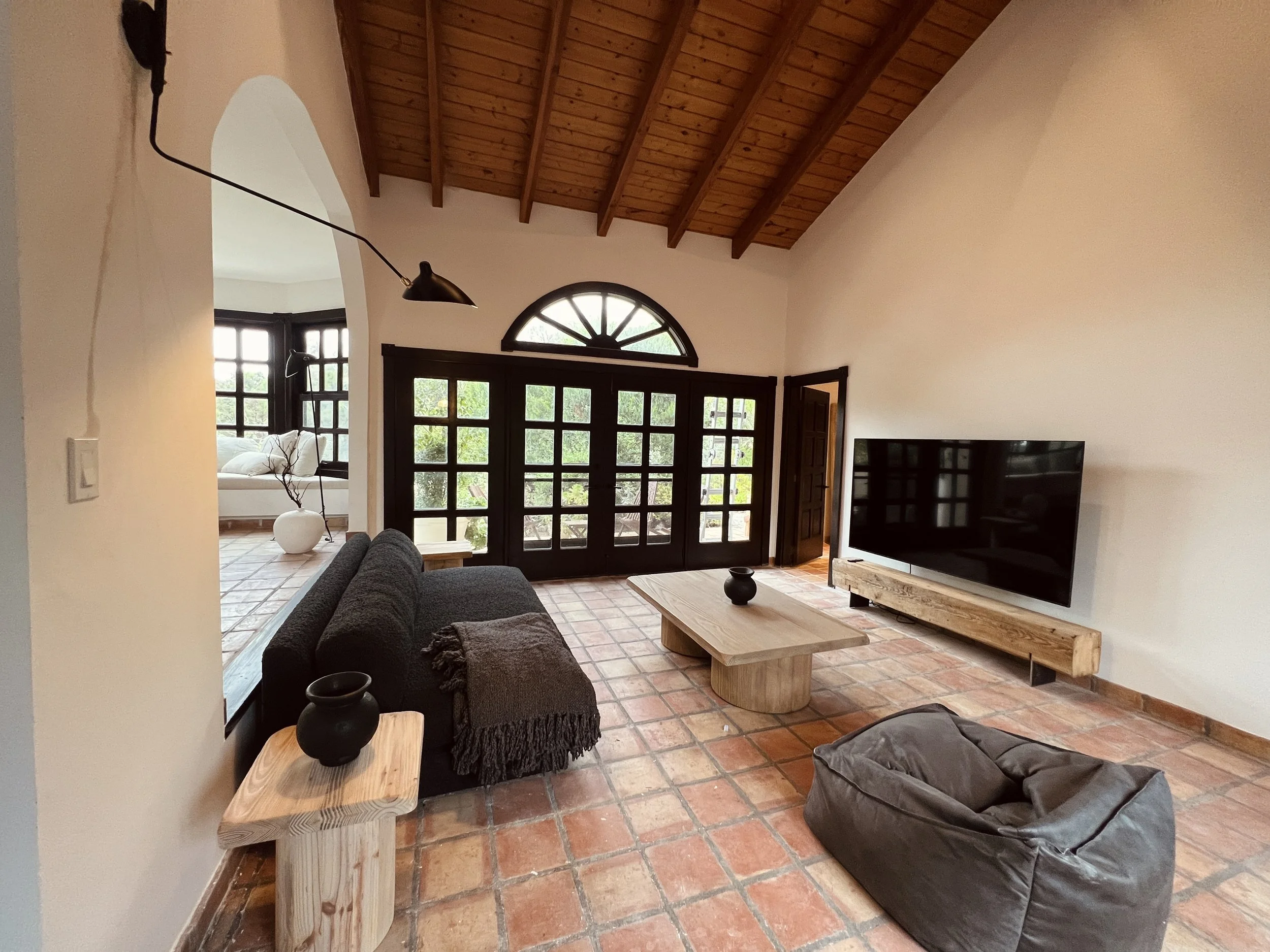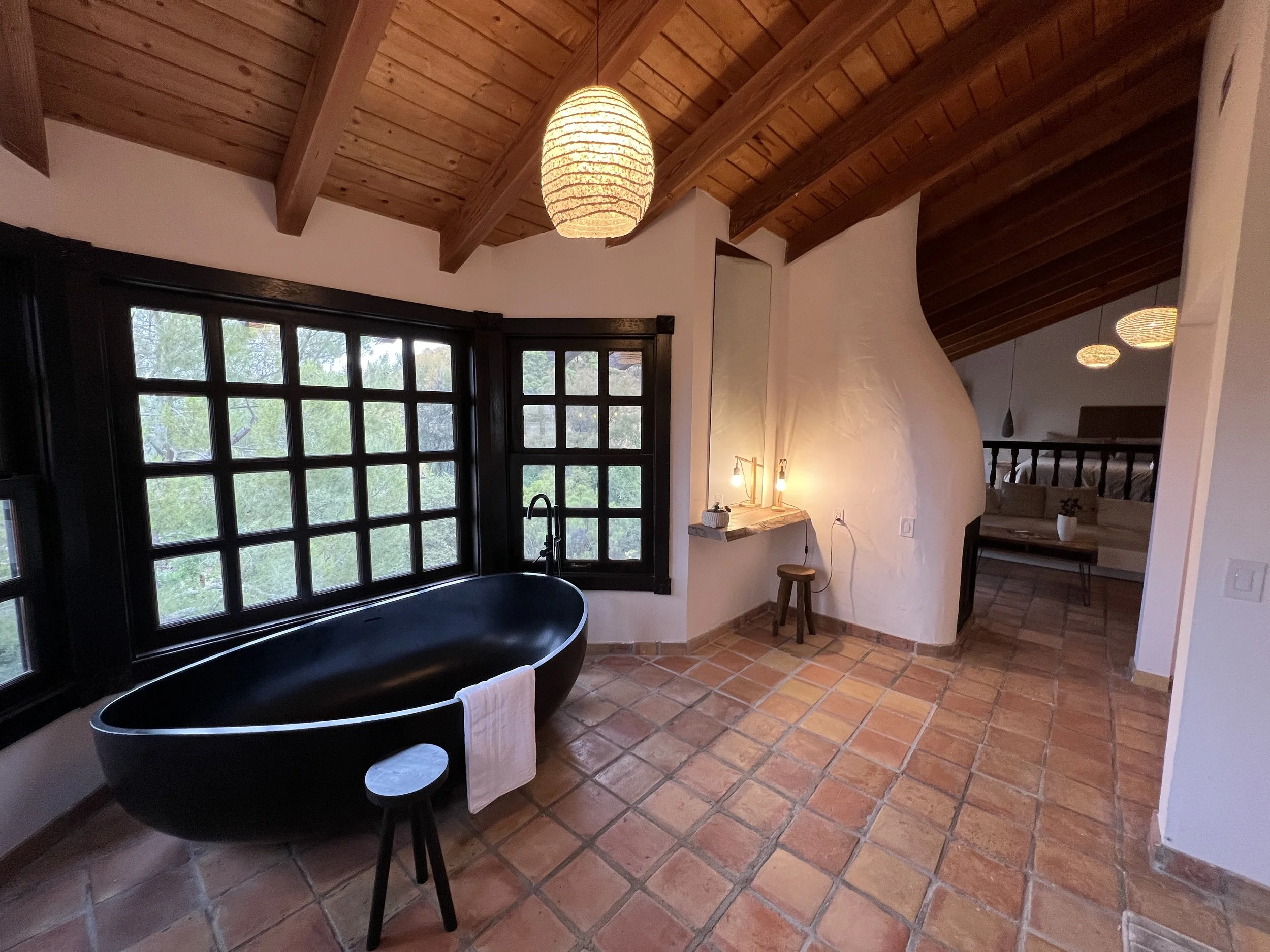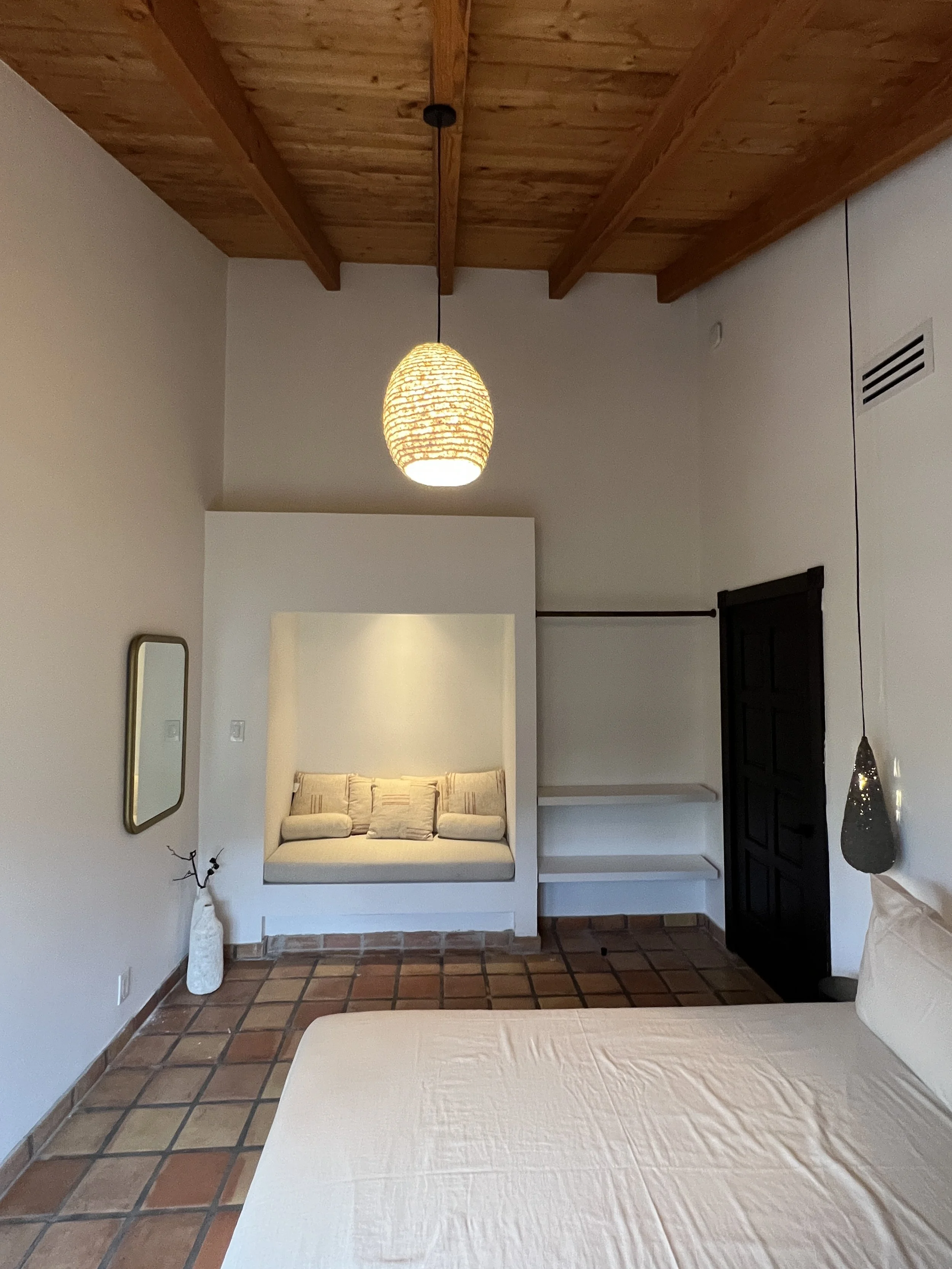 The renovation of the Buena Vista Farm House focuses on balance — preserving the warmth of traditional materials while introducing a sleek, modern aesthetic. The exposed wood ceilings, handcrafted terracotta floors, and textured plaster walls maintain the farmhouse’s authentic feel. Meanwhile, new design elements such as black fixtures, minimalist lighting, and clean lines bring a fresh, contemporary tone to the space.