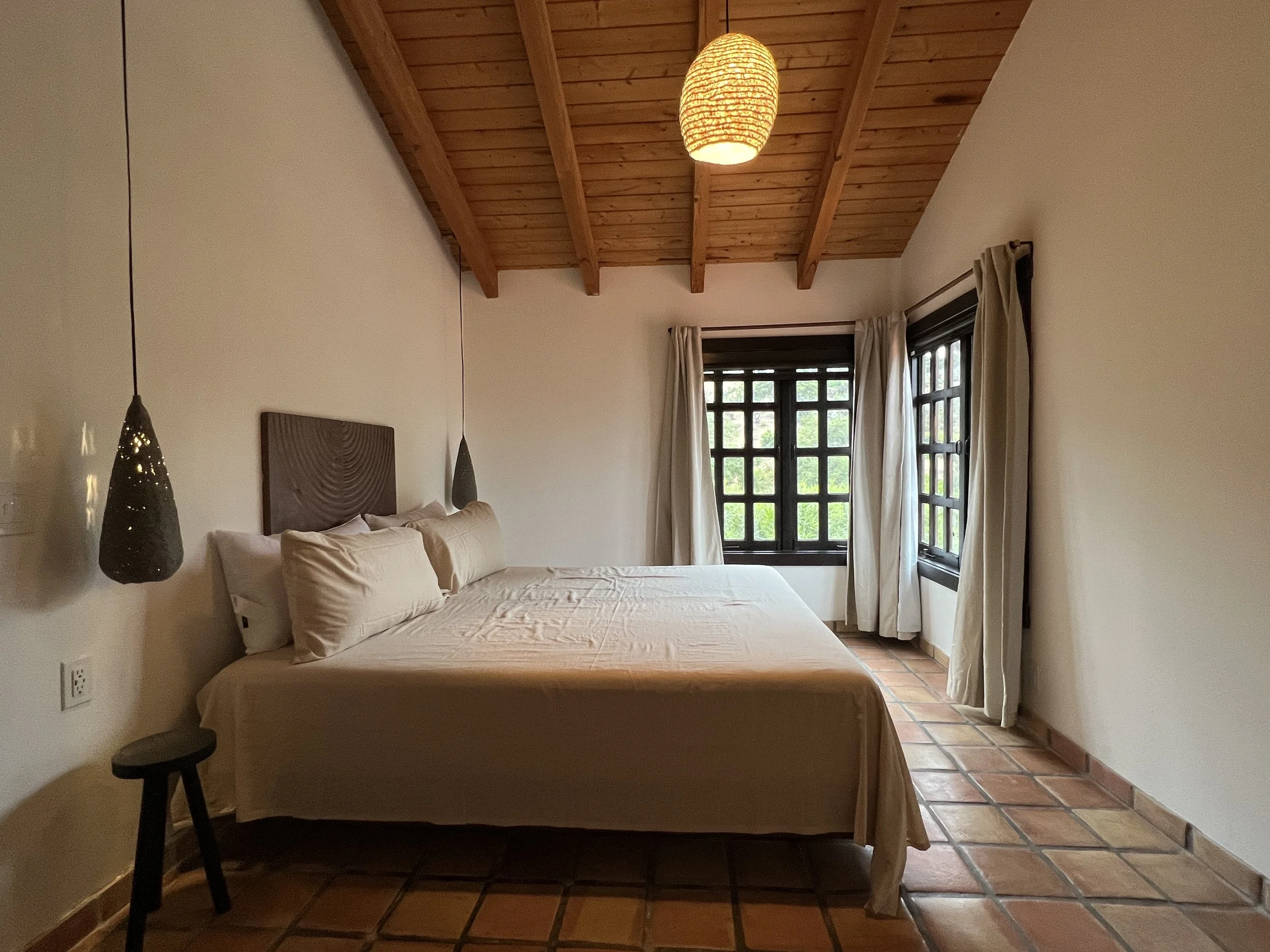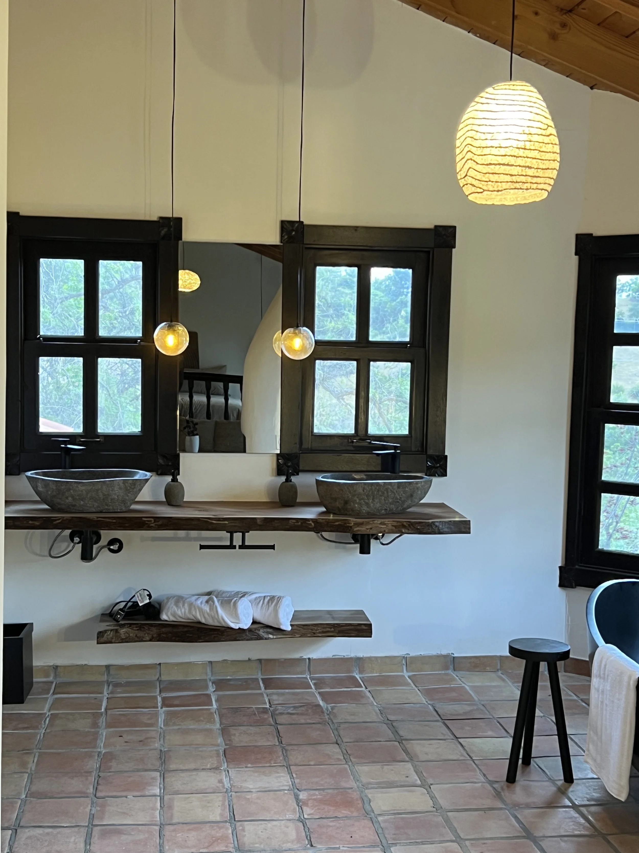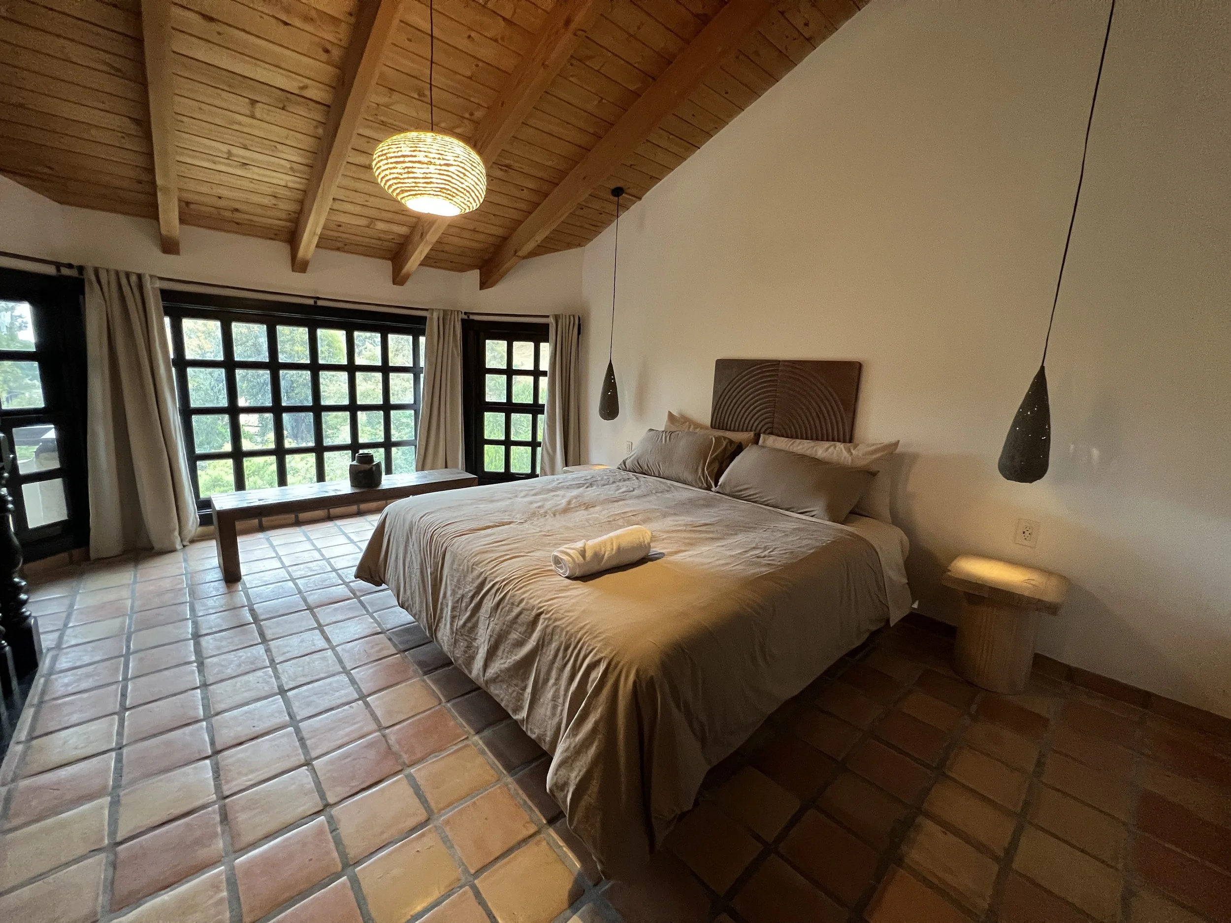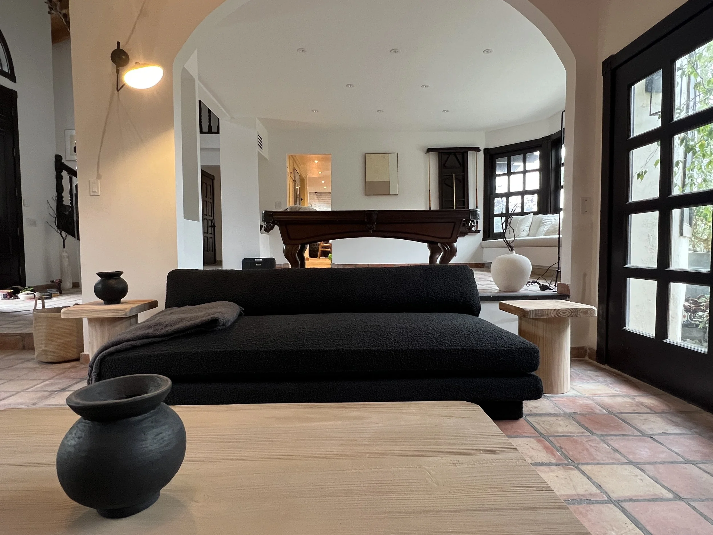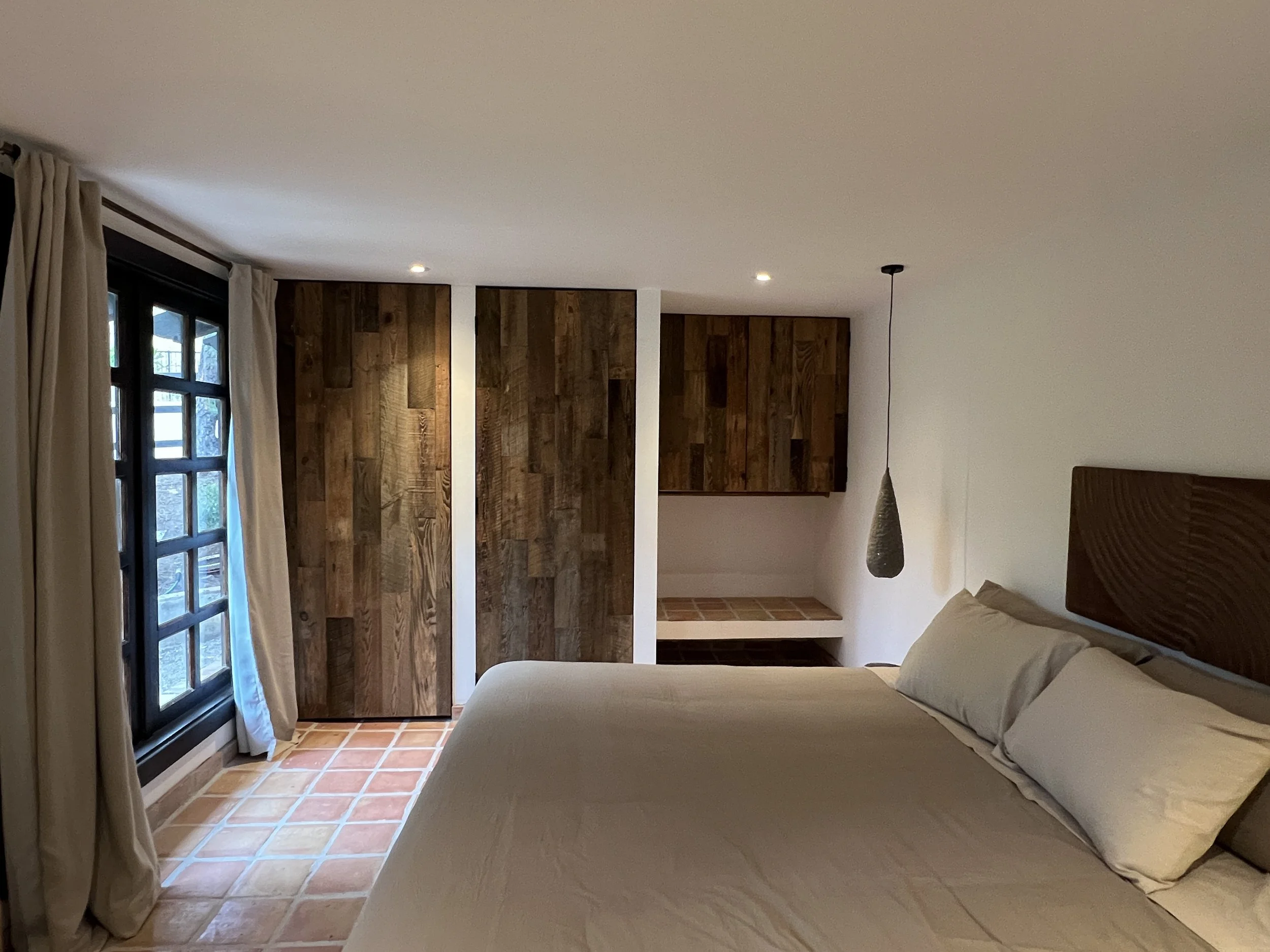 The renovation of the Buena Vista Farm House focuses on balance — preserving the warmth of traditional materials while introducing a sleek, modern aesthetic. The exposed wood ceilings, handcrafted terracotta floors, and textured plaster walls maintain the farmhouse’s authentic feel. Meanwhile, new design elements such as black fixtures, minimalist lighting, and clean lines bring a fresh, contemporary tone to the space.