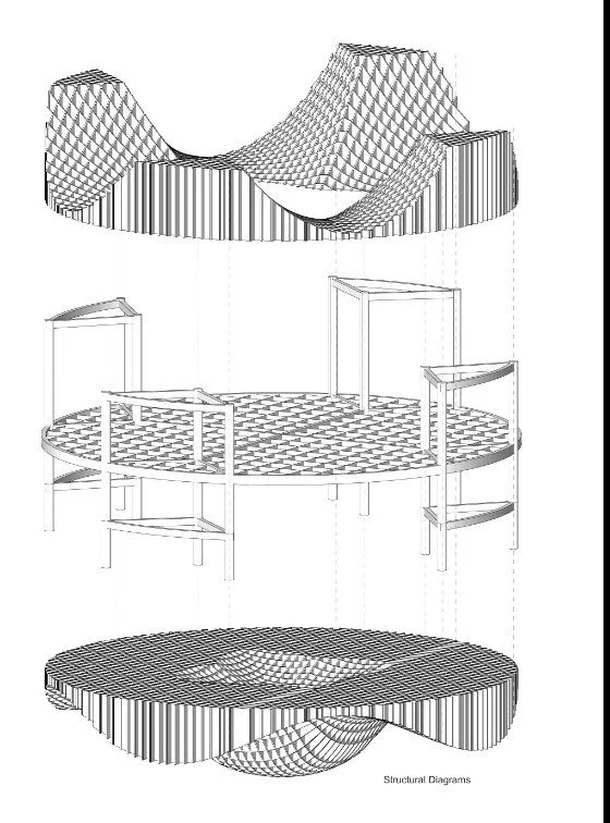 Waffle Slab System: Inspired by architectural logic, waffle slabs distribute loads to four standing corners, creating both strength and elegance. Wooden lamella pieces are CNC-cut with precise notch connections, ensuring structural coherence.